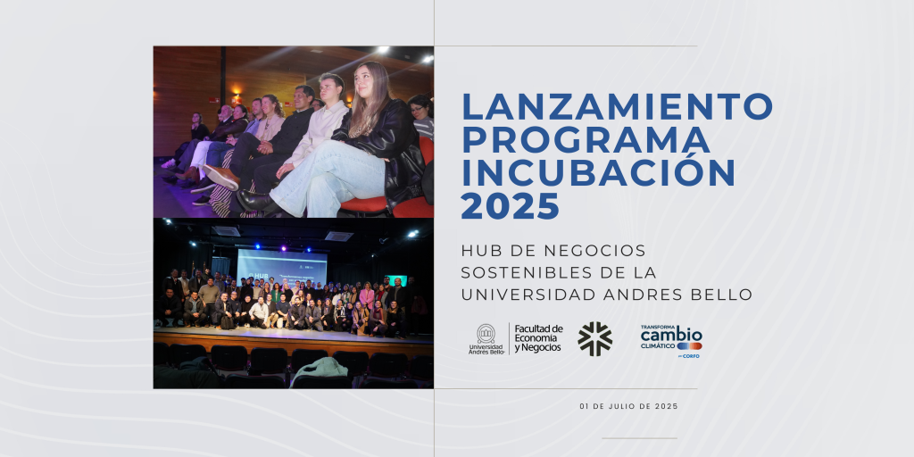 El Hub de Negocios Sostenibles de la Facultad de Economía y Negocios de la Universidad Andrés Bello (UNAB) dio el vamos institucional a la segunda generación de su Programa de Incubación 2025, esta vez, haciendo el match presencial entre los proyectos de estudiantes y alumnis seleccionados de la Casa de Estudios y el grupo de mentores que los acompañarán en cada fase del proceso. A la ceremonia fueron invitados, además, representantes del ecosistema de innovación local y nuestro programa nacional Transforma Cambio Climático.