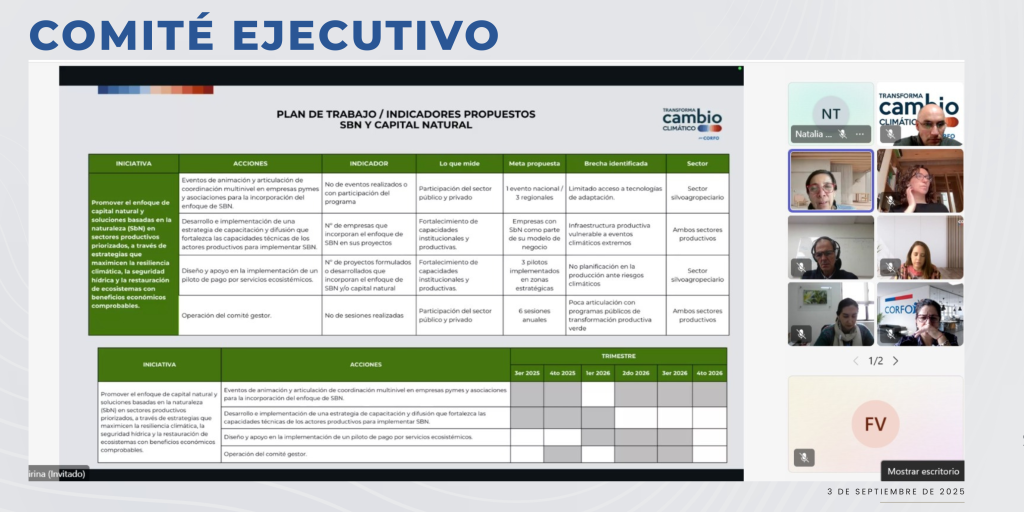 En cuanto al plan de trabajo de Soluciones Basadas en la Naturaleza y el enfoque de Capital Natural, se informó que desde la Gerencia de Desarrollo Territorial y de Capacidades Tecnológicas de Corfo, recibieron la aprobación para licitar el diseño del Observatorio Regional de Biodiversidad y Valorización de Capital Natural en la región de Aysén, que funcionará como plataforma para la gestión de datos sobre biodiversidad y cambio climático, fortaleciendo la toma de decisiones frente a la implementación de estrategias de financiamiento aplicadas a la conservación del capital natural, a pilotos demostrativos de modelos sostenibles replicables en la región y al fortalecimiento de la gobernanza climática en Aysén. Al respecto, la gerenta del TCC valoró el aporte del CR2 al proyecto en su calidad de integrante de la gobernanza del Transforma y adelantó que ya están en condiciones de licitar.