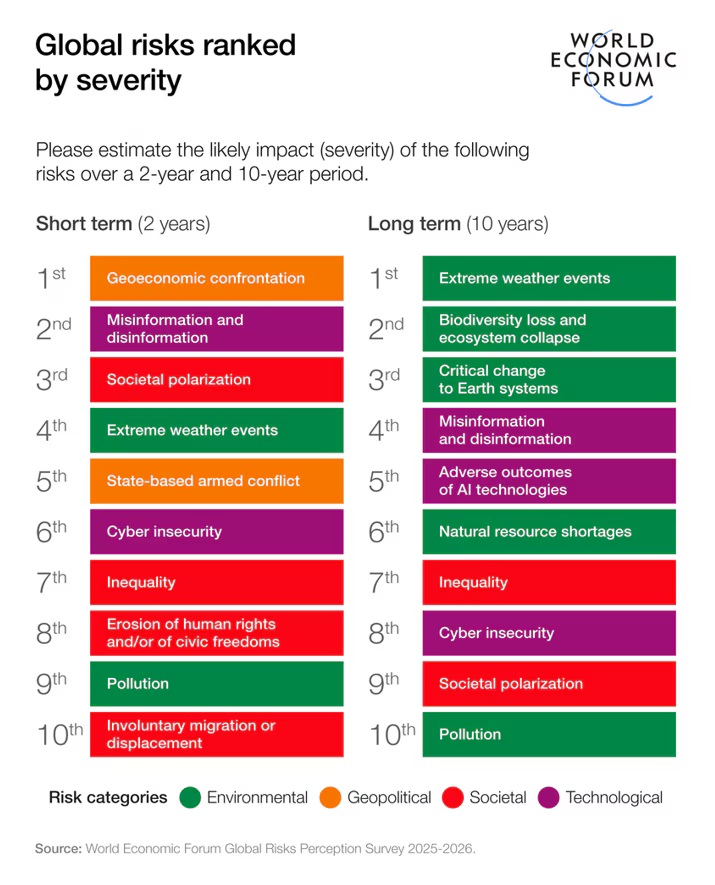 Antes de que comenzara la Reunión Anual, el Foro publicó el Informe de Riesgos Globales 2026. Clima extremo Los acontecimientos cayeron del segundo al cuarto lugar en el ranking este año, no porque sean un riesgo menos urgente, sino porque la fragmentación geoeconómica y la polarización social se han vuelto más apremiantes.